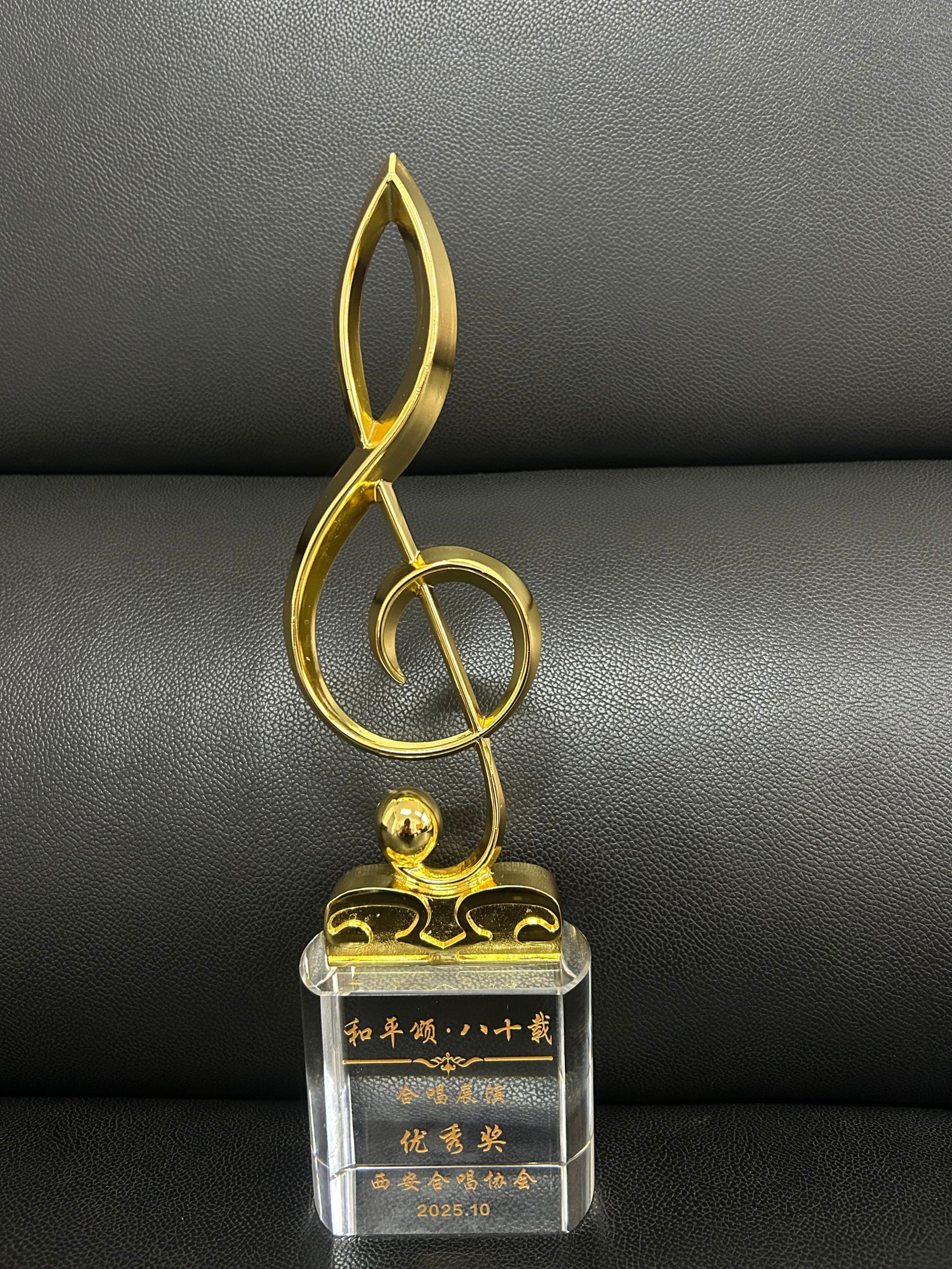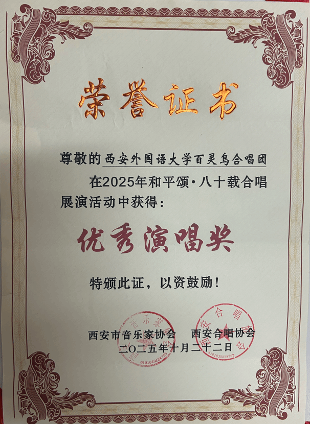 10月22日,西安外国语大学“百灵鸟”老年合唱团在西安合唱协会与西安市音乐家协会联合主办的“2025年和平颂·八十载合唱展演”中荣获“优秀演唱奖”。